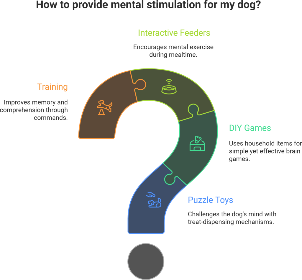 Q3. What are some effective ways to mentally stimulate my dog? There are many ways to provide mental stimulation, including puzzle feeders, scatter and sniff games, stuffed food toys, and training sessions. You can also create DIY games using household items like muffin tins or empty bottles. Rotating toys and introducing new challenges regularly helps maintain interest.