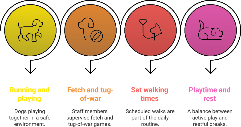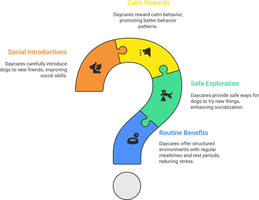 Structured daycare creates a safe space for dogs and reduces their stress through predictable routines and controlled interactions [1]. These elements support development:
