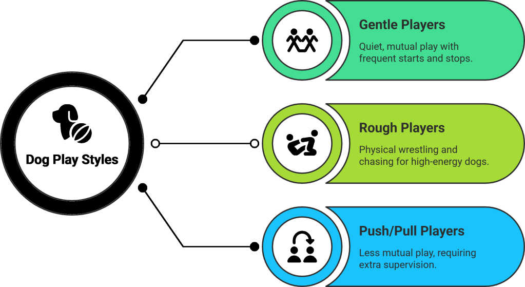The best daycares keep playgroups to 12-15 dogs at most [27]. They create manageable groups based on size, energy level, and matching play styles. Dogs show these distinct play styles: