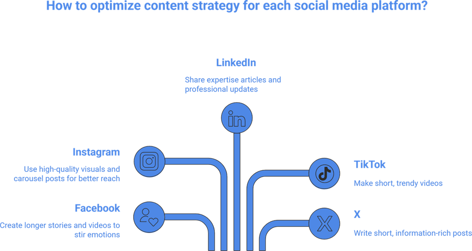 Social media platforms have evolved their own distinct cultures and audience expectations. People on Instagram look for visual appeal and authenticity. LinkedIn users want business insights, and X (formerly Twitter) users prefer quick information bites [2].