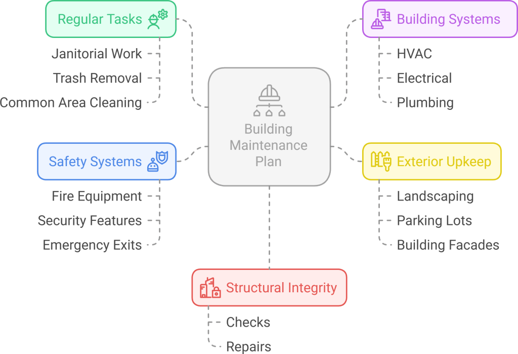 Regular tasks include janitorial work, trash removal, and common area cleaning. A detailed maintenance plan also covers: